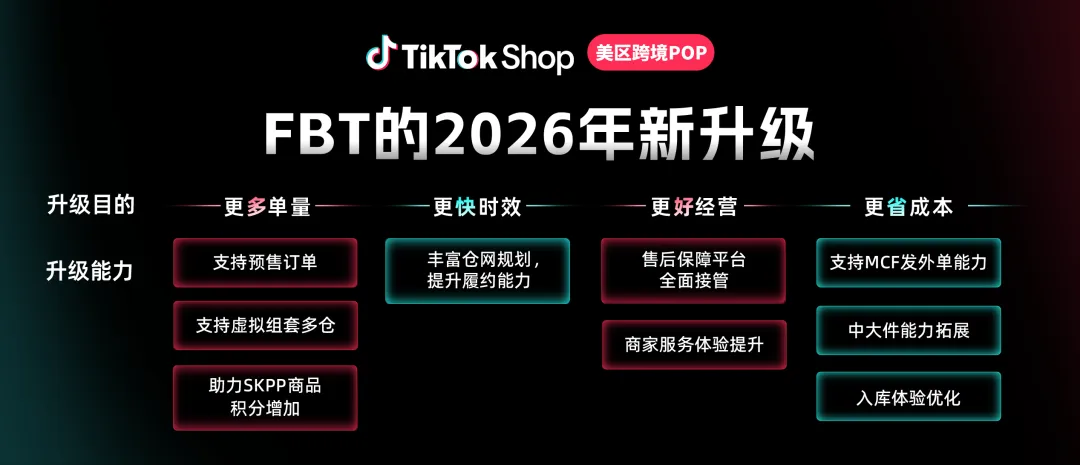 2026年,FBT将围绕“多快好省”持续升级:不仅支持预售订单、虚拟组套多仓发货;还进一步丰富仓网规划以提升履约能力;此外,也会拓展MCF发外单能力以及中大件服务,全面提升商家体验,让经营更加省心。