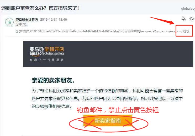 有卖家发现,自己收到的并不是来自亚马逊官方的邮件,而是“代发”,经证实,这其实是一个钓鱼邮件,卖家们千万不要点击以下的黄色按钮。
