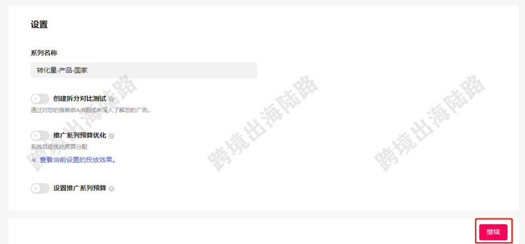 7.推广系列预算优化和设置推广系列预算,是系列预算的设置。我们这里以组预算为例。所以不设置黄框内的系列预算。TikTok广告推广系列预算版本教程可点头像查找。