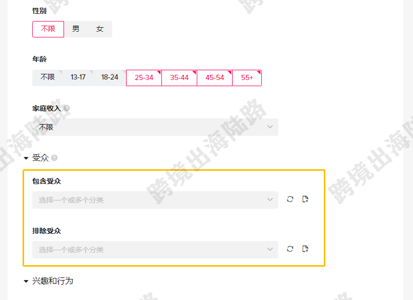 26.设置兴趣和行为。不是强制都要设置,一定要按自己的广告需求进行设置。
