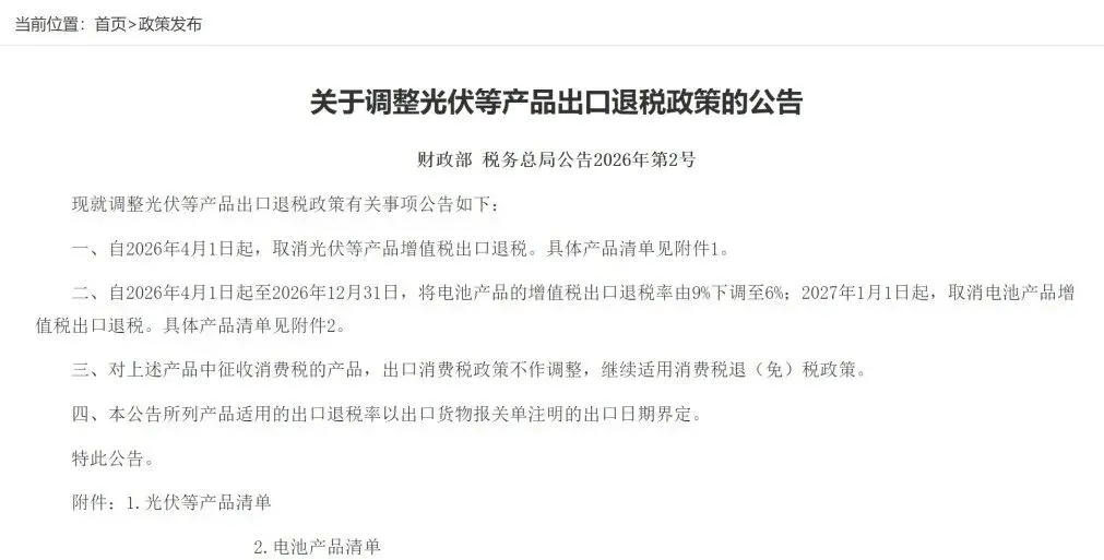 近日,财政部、税务总局发布了《关于调整光伏等产品出口退税政策的公告》。公告显示,自2026年4月1日起,取消光伏等产品增值税出口退税。