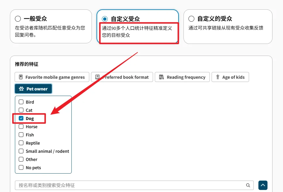 可以。平台提供超过 90 种受众标签。例如,你可以专门向 50 位“营养补充剂使用者”或“狗主人”提问,而不是向普通大众提问。
