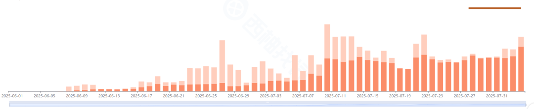 在 2025 年 6 月上旬综合流量得分基本为 0,6 月中旬开始逐渐上升,7 月 8日开始流量猛增10 ~11日达到一个高峰值 741,随后又有所下降,然后趋于稳定水平