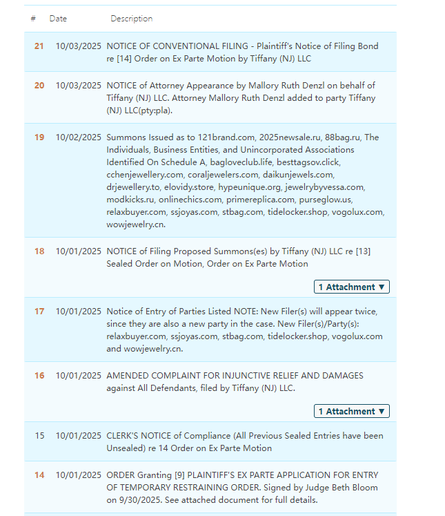 此案为商标维权,涉及Tiffany多项美国注册商标,文字商标有 TIFFANY & CO.、TIFFANY图形商标罗宾鸟蓝盒子、蓝珠宝袋,就连蓝色也已经注册了商标,以下是涉及商标具体信息,未经授权不得擅自使用,侵权风险极高,跨境卖家尽快检索下架,避免TRO侵权风险!