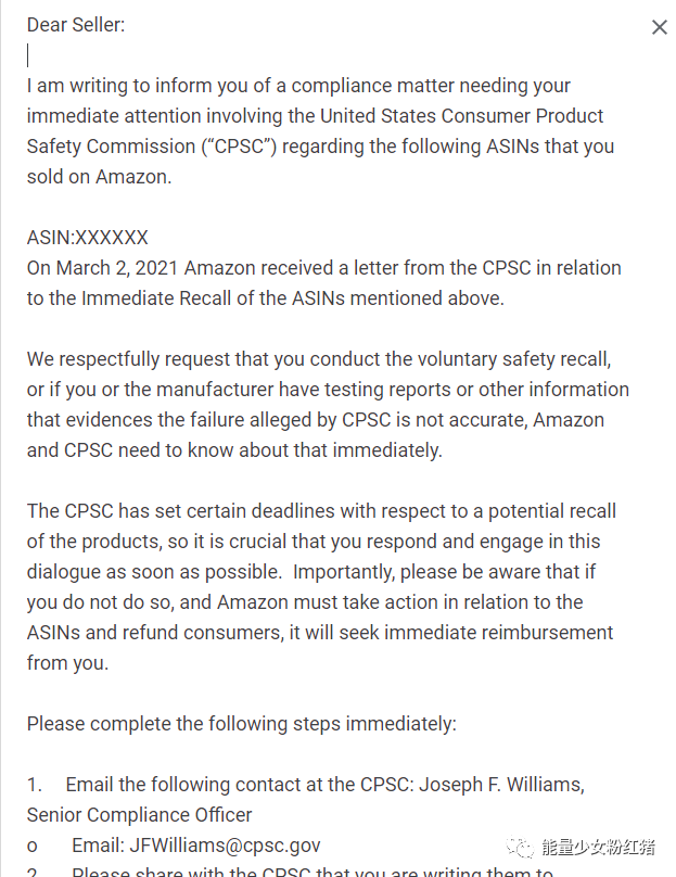大家看邮件,这个里面就直接有要求你联系CPSC.这种和我们之前遇到的常规类型不太一样。