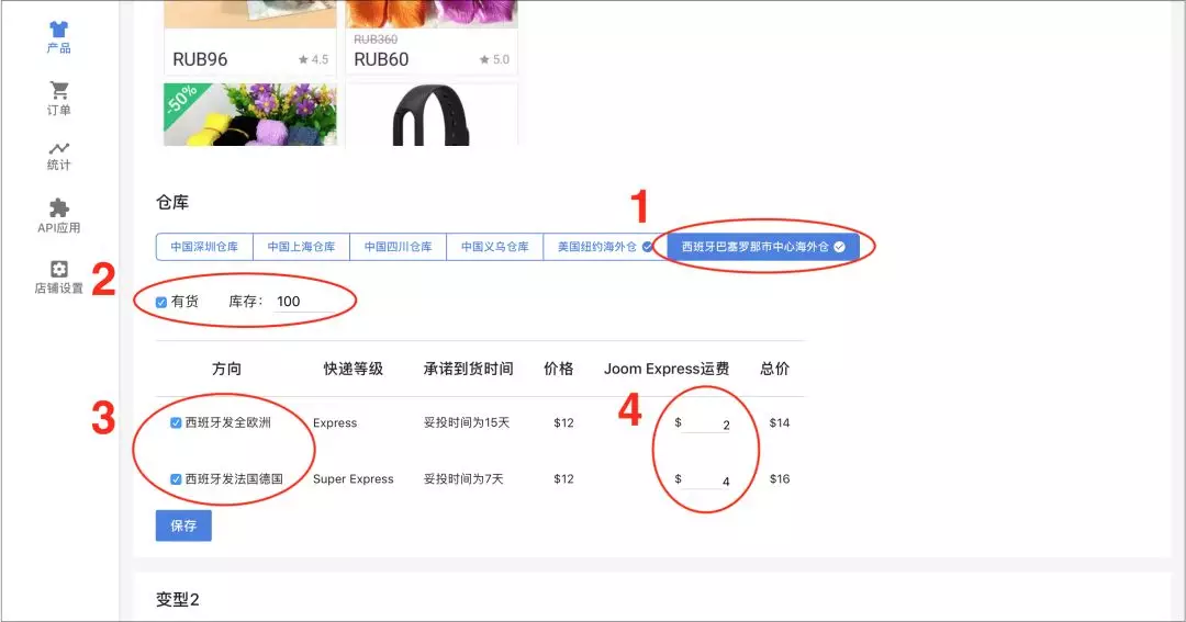 卖家可以自行设置哪些产品支持Joom Express,按所属仓库为每一个产品变型单独设置库存,并按发货方式以及方向为产品设置Joom Express运费。目前,卖家只能使用后台来设置支持Joom Express的产品。