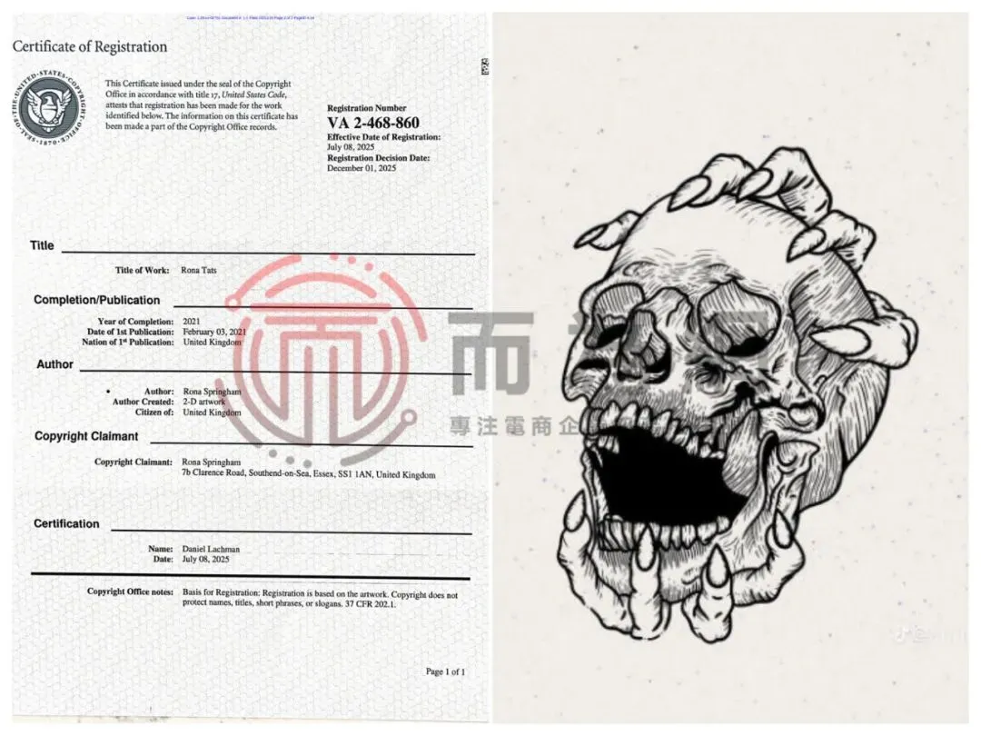 由于本案涉及的版权图片暂未公开,以下是原告公开的版权证书,以及小为根据版权证书及原告名字排查到的同名作品,供卖家们参考!未经授权以下图片及原告名下的其他作品都不能擅自使用。
