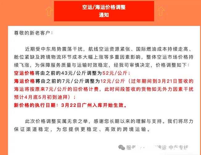 一家主营中东线路的跨境物流公司最新通知,