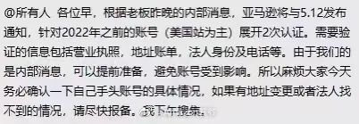 近日,卖家圈里的一张截图显示,“根据内部消息,亚马逊将针对2022年之前的账号(美国站为主)展开2次认证。需要验证的信息包括营业执照,地址账单,法人身份及电话等。”