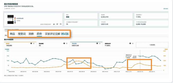 通过商机探测器选定目标细分市场后,可以在趋势板块查看过去12个月商品搜索量、商品数量、平均价格、搜索转化率等指标,了解产品需求和供给的季节性变化。如图中进入“Notebook”细分市场,能看到过去12个月中,在7/8月和1月寒暑假临近开学时会有流量高峰期,具有一定的季节性,您可以根据数据提前进行备货与促销计划。