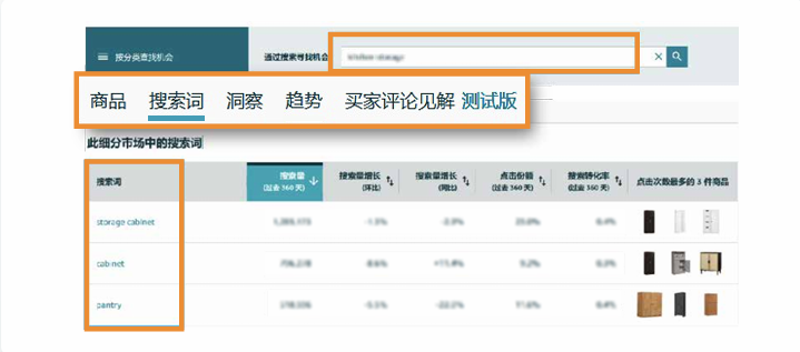 前往亚马逊卖家平台,点击“增长 > 商机探测器”,在搜索栏输入您的目标类目,得出目标市场。进一步探索使用该工具,掌握一手消费需求。