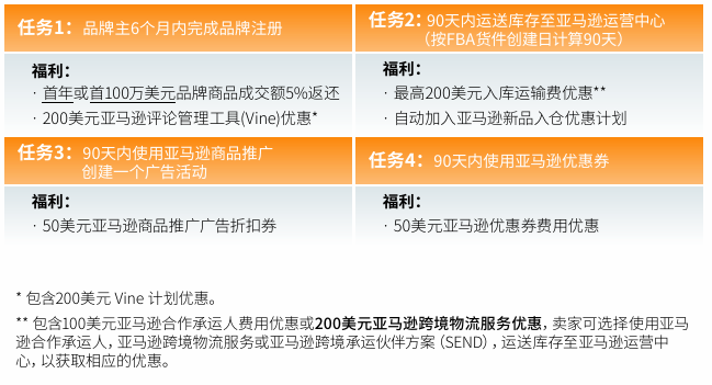 注意:一个新卖家在单站点最高可获5万美金返还,最多可以享受欧美日三次全套新卖家入门大礼包福利符合条件的品牌所有者最高可获15万美金返还!现有卖家在上述站点开设新业务也可享受此福利。