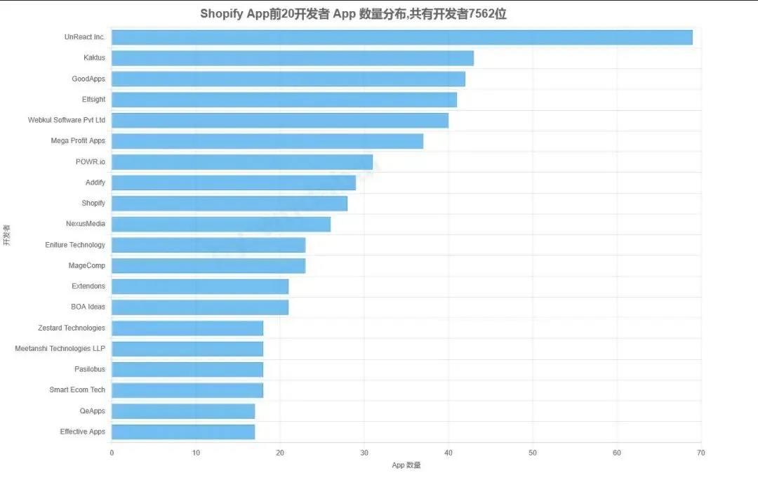 上图显示在shopify应用市场共有7562位开发者,其中开发应用最多的有69个应用。