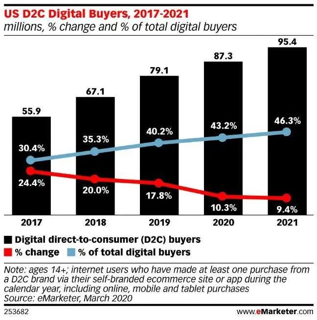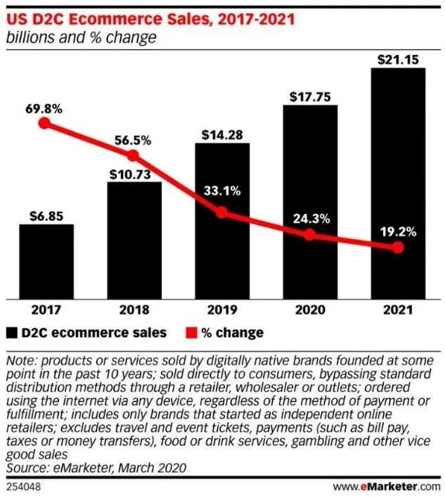 从2016年到2019年,DTC电商的增长速度是电商行业总体销售额增长速度的三到六倍。但是随着竞争的加剧和行业的不断成熟,DTC的增长在2020年将不到电商销售总量的两倍(前者预计为24.3%,后者预计为13.2%)。