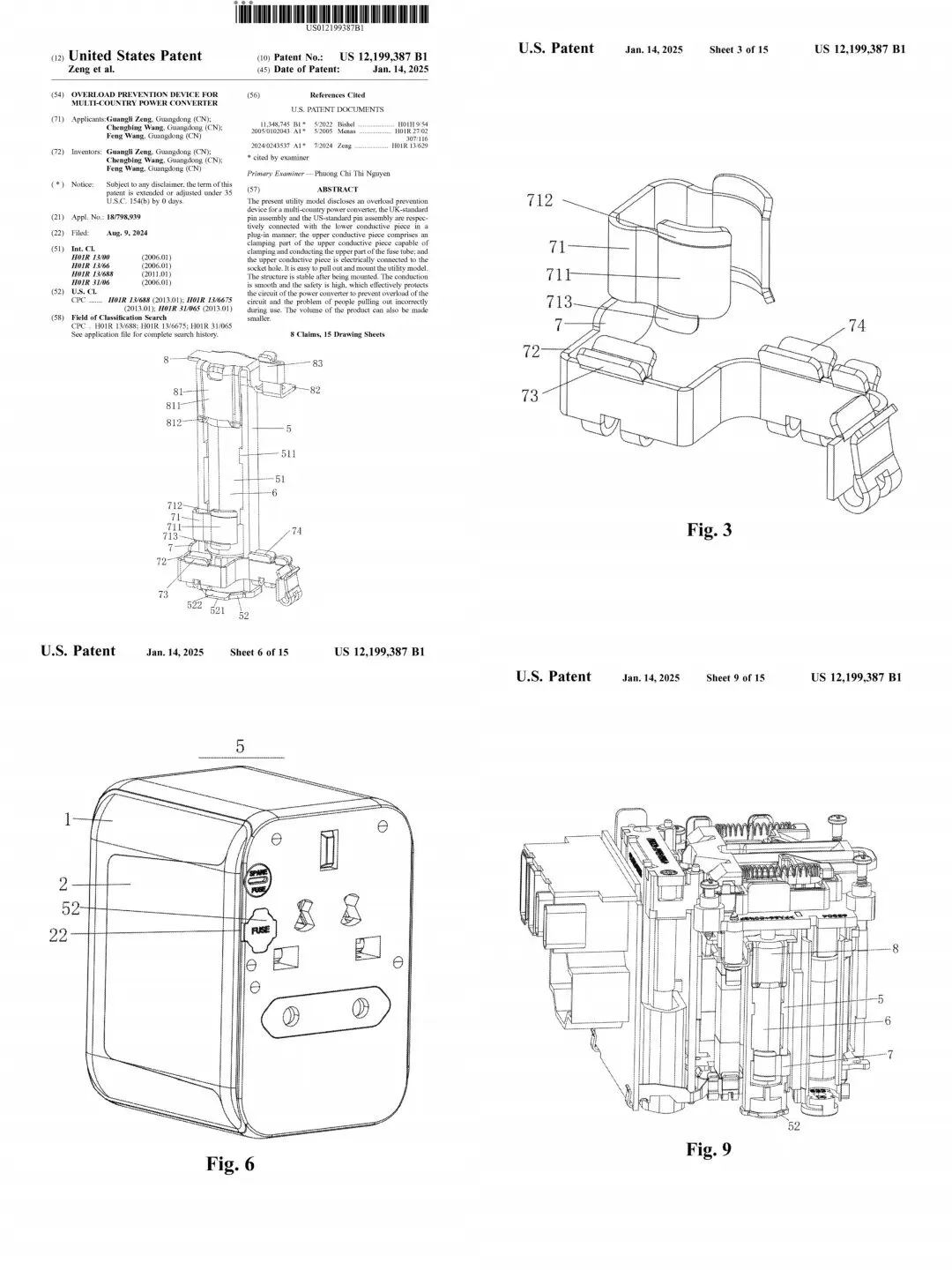 本案涉及发明专利维权,原告受原发明人转让的发明专利US12199387,保护的核心技术特征包括:美英双标插脚与插座孔内置上下盖;导电夹片以弹性夹臂夹紧保险丝管形成回路;保险丝盒为下盖内置抽屉式可拆卸结构;美英标插脚支持插接式切换。