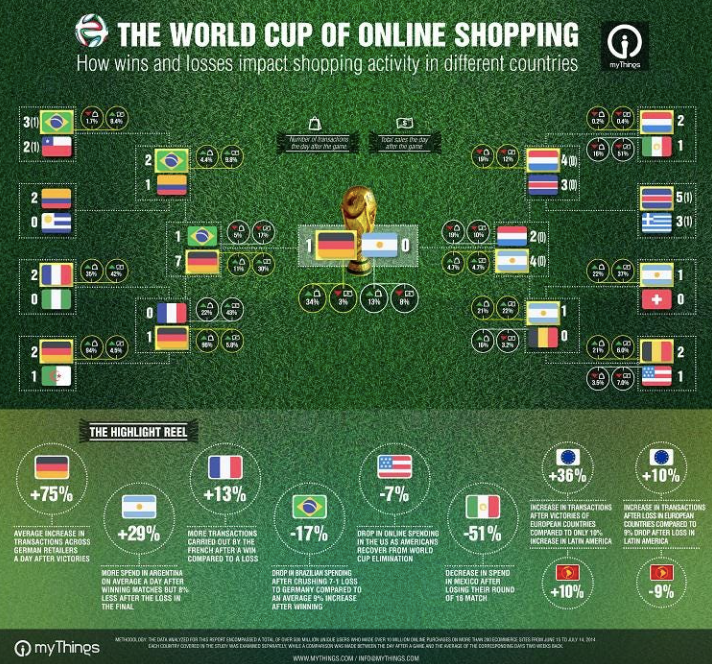 上图是2014年世界杯期间,电商品牌服务公司myThings所做的调研,数据表明,世界杯的胜负对线上购物有明显的影响:
