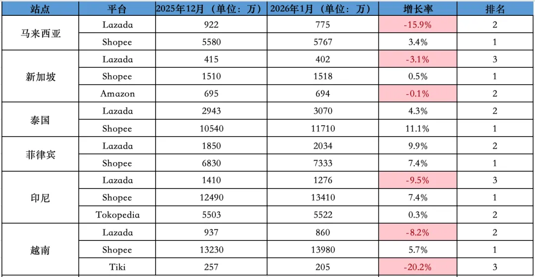 近日,数据分析网站 Similarweb 发布了 2026 年 1 月份东南亚各电商平台访问量(桌面+移动端)及相关数据,具体如下:
