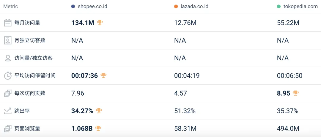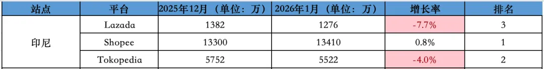 印尼站点,本土电商平台 Tokopedia 访问量较 12 月份下降 4%,从 12 月份的 5752 万降至 1 月份的 5522 万;