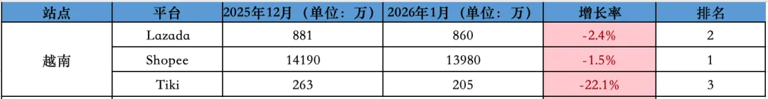 越南站点,本土电商平台 Tiki 访问量较 12 月份下降 22.1%,从 12 月份的 263 万降至 1 月份的 205 万;