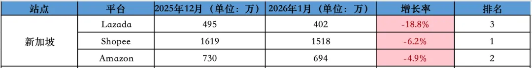 新加坡站点,Amazon 访问量较 12 月份下降 4.9%,从 12 月份的 730 万降至 1 月份的 694 万。