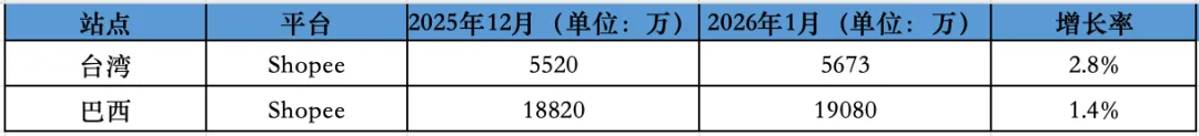 另外,Shopee 台湾站访问量从 12 月份的 5502 万涨至 1 月份的 5673 万,涨幅为 2.8%;Shopee 巴西站的访问量从 12 月份的 18820 万涨至 1 月份的 19080 万,涨幅为 1.4%。