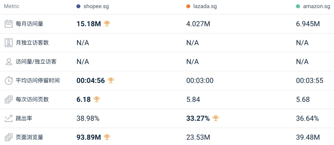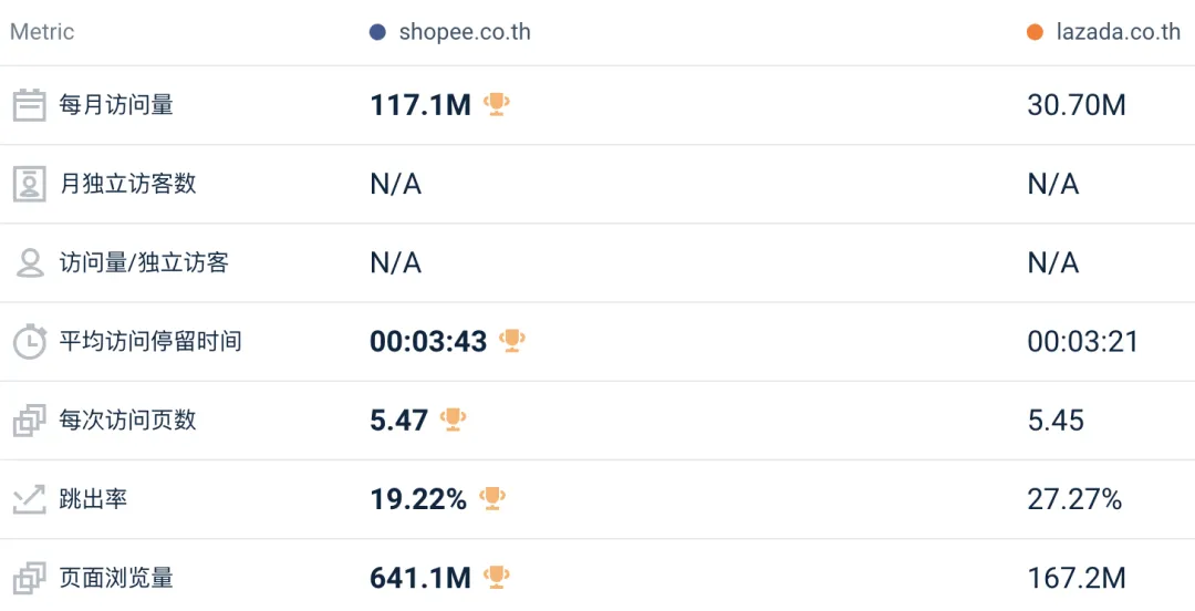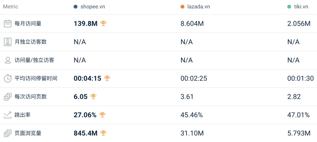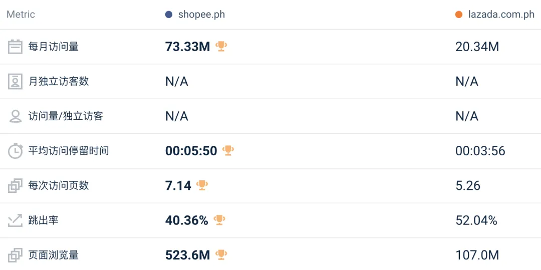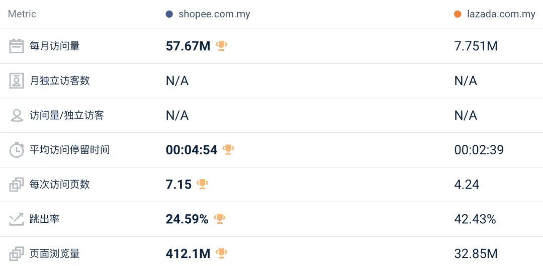 其中,Lazada 各站点的网站总访问量为 8417 万,较上月下降 4.9%;Shopee 各站点网站总访问量为 5.371 亿,较上月下降 0.8%;