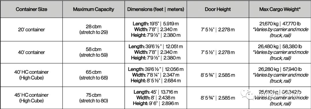 如果大家想简单看一下自己的产品是否符合整柜运输的条件,可以参考如下表格的尺寸,其中cbm代表立方米。