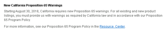 从2018年8月30号开始,加利福尼亚州更新65号提案警告,亚马逊卖家需根据政策更新亚马逊后台的产品信息