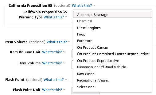 通过Vendor Central创建产品时:转到“Item”,选择“Add Products”并选择“Add a single Product”,选择合适的California Proposition 65 Warning和相关的加利福尼亚提案65化学名称。