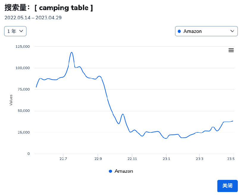 此图是一年时间段的搜索量趋势记录,从这个趋势我们可以看出camping table这个细分市场在全年里的淡旺季。