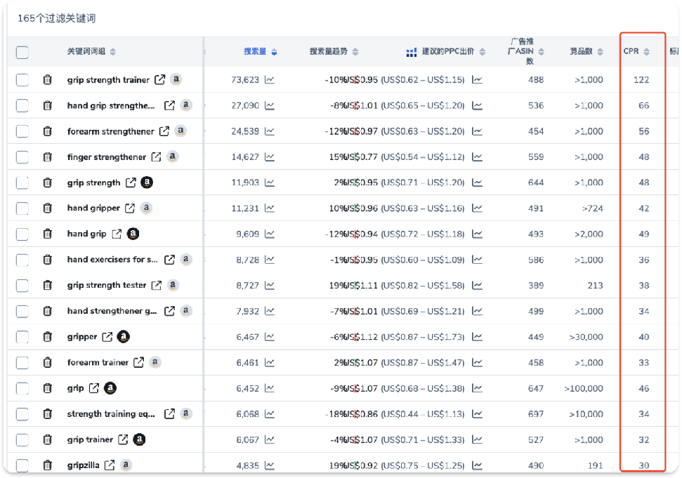 H10的关键词数据维度非常丰富,其中有一个h10独有的关键词数据叫做CPR,CPR是Cerebro product rank的缩写,含义就是某一款产品要在某个关键词下面上到首页 8天总共需要出多少单。