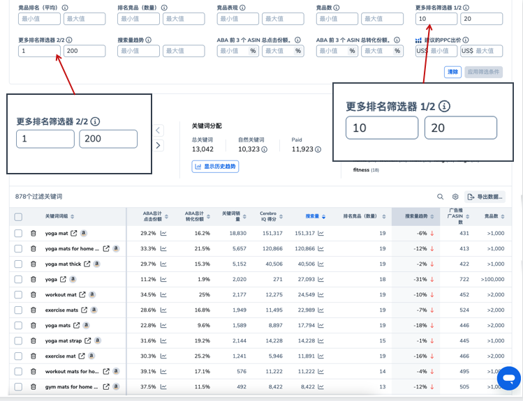 如图所示,与yoga mat这个关键词相关性越强竞品排名数量这个值就越大。相关性不高的关键词,竞品排名数量甚至为0。