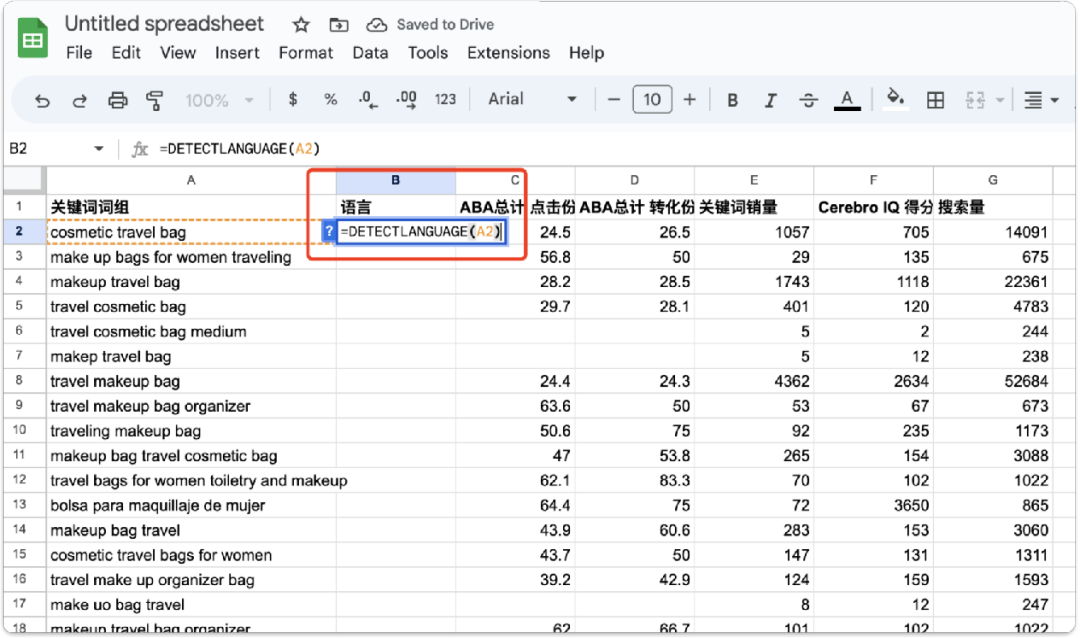 我们可以把任何来源的关键词和搜索量数据放进Google在线表格,然后在关键词后面加一列,输入这个公式,就可以识别出来该关键词的语种了。