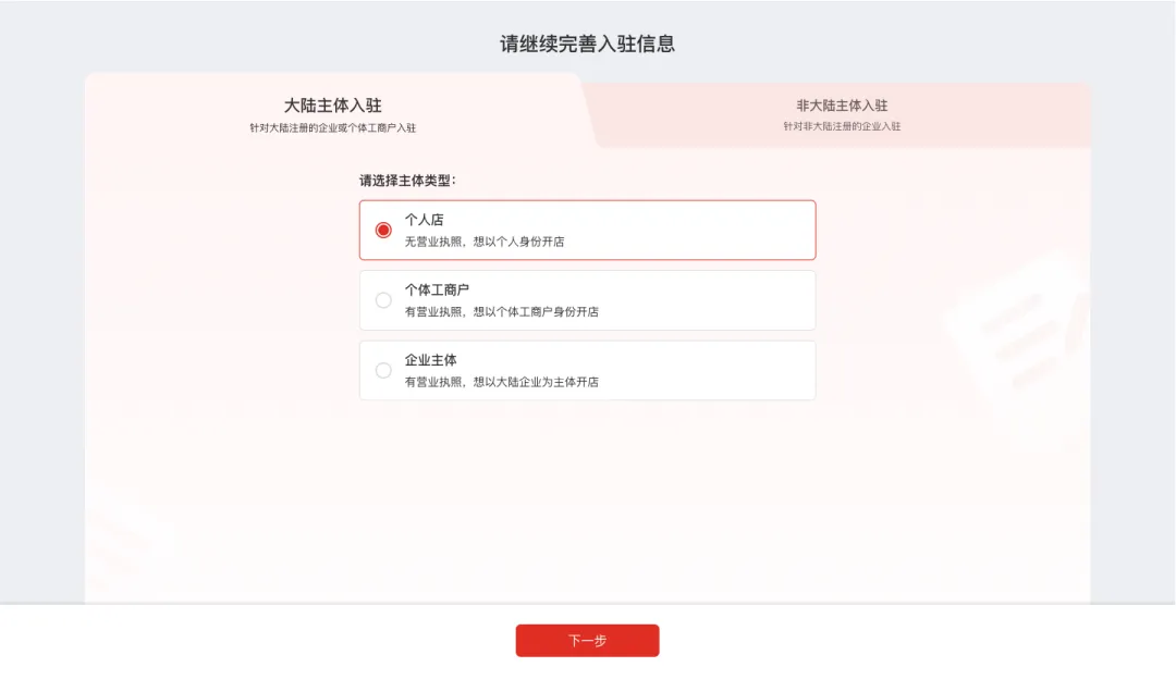 1. 选择主体类型,目前支持大陆个人店、大陆个体工商户、大陆企业、香港企业