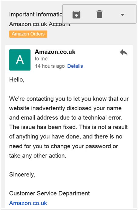 今年9月,《华尔街日报》爆出亚马逊员工涉嫌向卖家出售客户数据的新闻。为解决该问题,亚马逊开启了一系列调查,并已于10月删除了一系列员工。但两个月后,仍有客户被告知他们的信息已被披露,如下图。