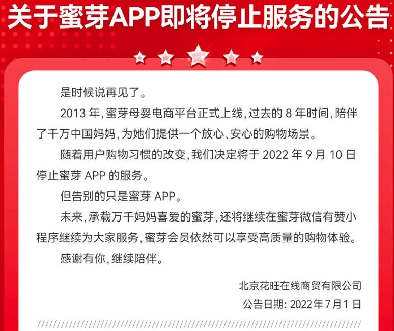 7月1日,老牌母婴垂直电商“蜜芽”官网发公告称,将于2022年9月10日停止蜜芽APP服务,蜜芽将继续在蜜芽微信有赞小程序继续为大家服务。