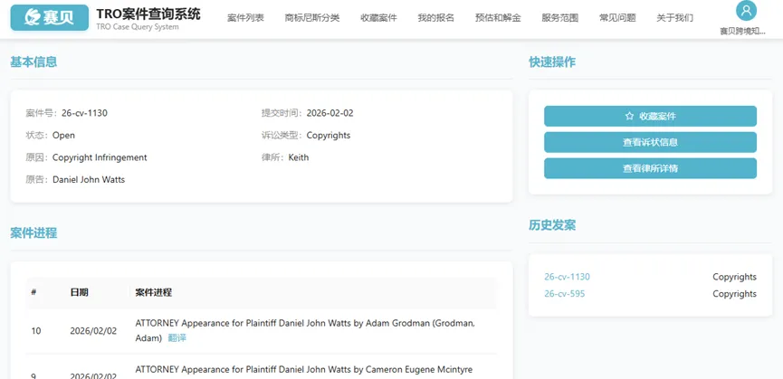 从系统中还显示原告Daniel John Watts之前还发过维权案件26-cv-595,起诉日期为:1月20日。