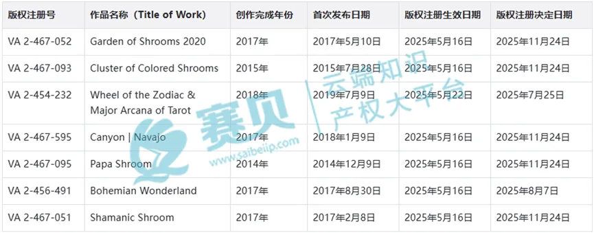 七项作品均为2D原创插画艺术(2-D artwork),首次发布地均为澳大利亚,版权持有人均为Daniel John Watts。其中,作品VA 2-454-232(Wheel of the Zodiac & Major Arcana of Tarot)的版权主张不包含Rider-Waite塔罗牌的主阿卡那牌,仅包含原创排列构图及太阳、月亮、星座图案、背景设计等创意元素。