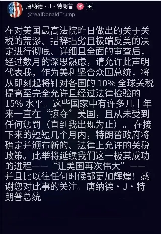 特朗普突然加码:距离推出 10% 临时关税仅一天,在社交媒体发文,称经过对最高法院“荒谬、极端反美”裁决的全面审查,决定将10%税率立即提高至15%,并宣称这是“完全合法、经法律检验”的税率。