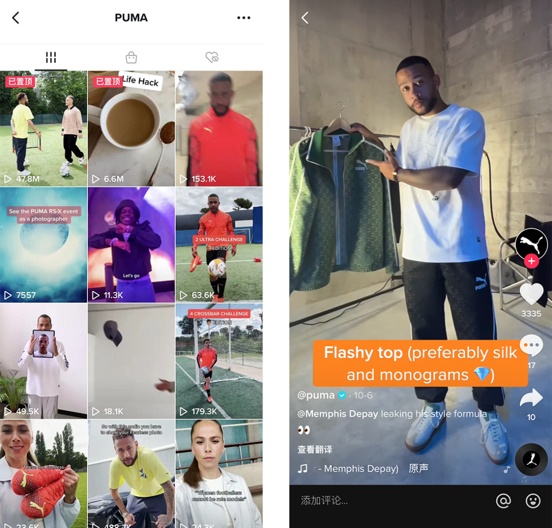 除了预热海报外,也可以选择和红人明星合作来提高曝光度。Puma近期就在TikTok上大量发布足球相关内容,并联合出战世界杯的知名球员Memphis Depay进行宣传,借助知名球星的影响力带动品牌在世界杯前期的热度。