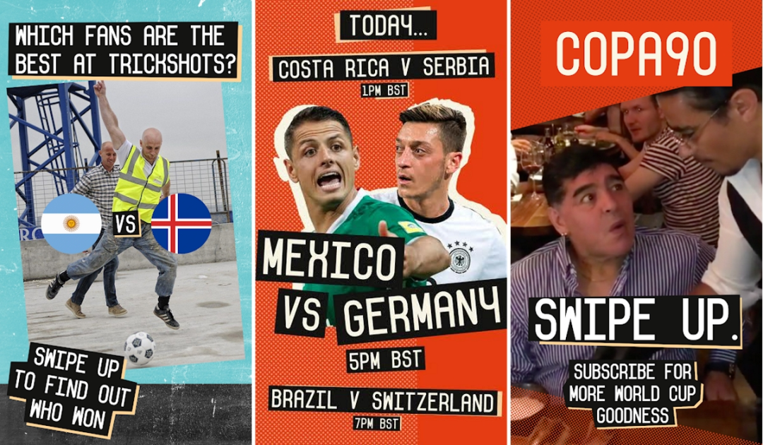 18年英国的知名足球媒体COPA90联合Snapchat定期向用户推送世界杯相关的内容,也非常值得借鉴。其内容有球迷对于赛场实况的搞笑反应、不同球队球迷的自嘲,还有相关赛事的预告,受到了不少用户的追捧。