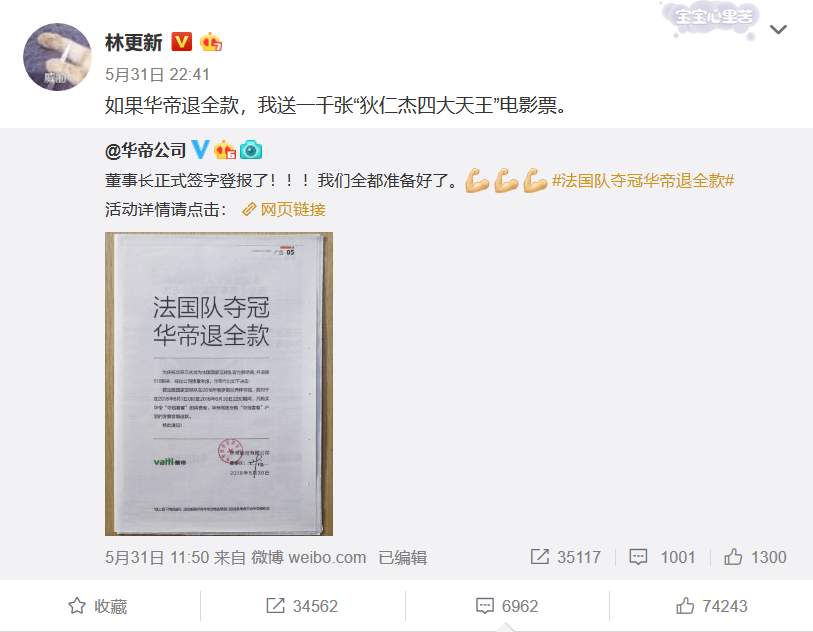 华帝在法国夺冠之后,发出了“法国夺冠退全款”的官方声明。