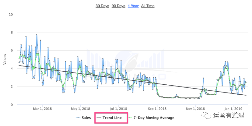 3)在历史销售图表中,你可以看到总体趋势:销售趋势上升还是下降。为了使此信息更加有效,您必须查看至少1年的数据。