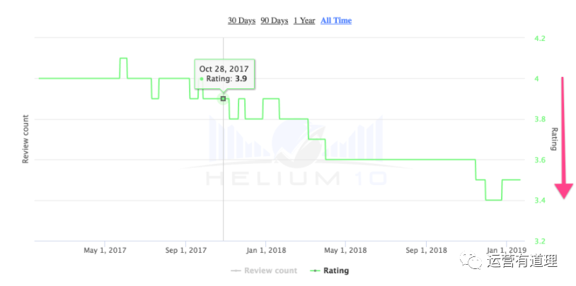 查看评分值是我的最爱。有时,一个listing起步很好,一旦收到太多不良评论,销量就会下降。例如,您刚刚看到的销售趋势下降的产品,随着时间的推移已经积累了许多不良评论: