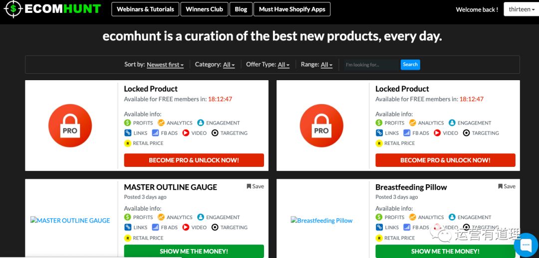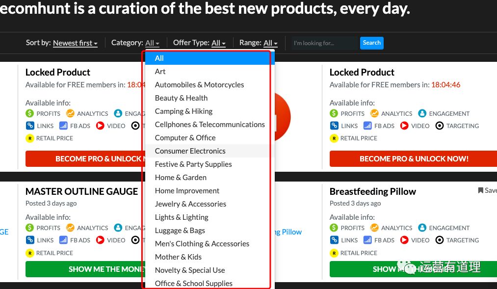知名的eComhunt ,在业内还是比较知名了。这是一个人工推荐产品的平台。从我的截图可以看出,免费版本要看某些产品还有时间延迟。