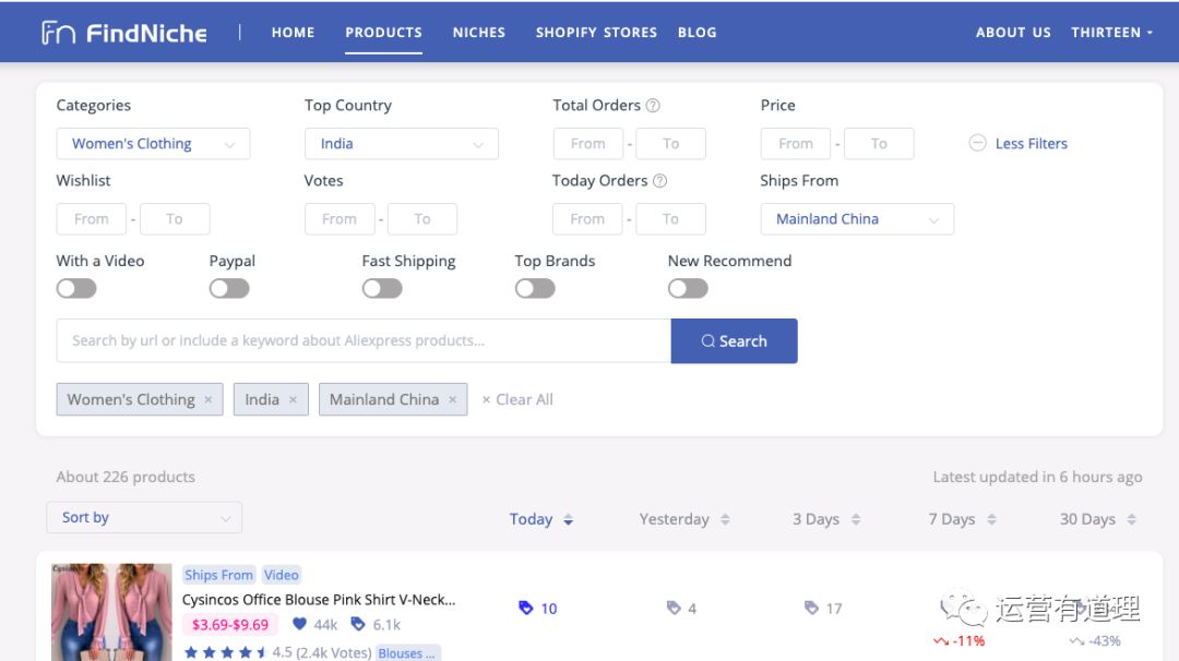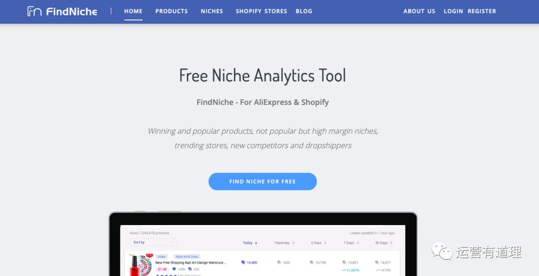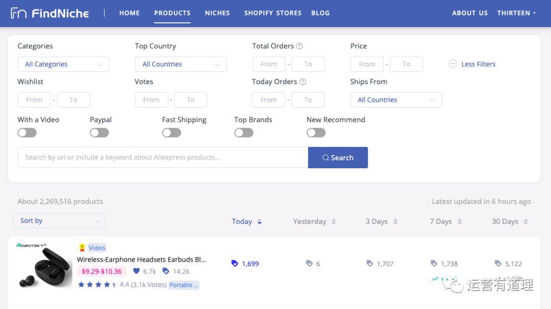 这是一款牛逼的、免费的利基产品分析工具。可以根据各种条件分析Aliexpress和shopify的产品。如下图,products这个栏目是分析aliexpress的,而Niches这个栏目是分析shopify的。