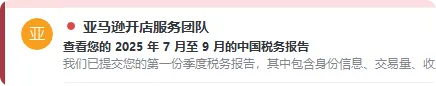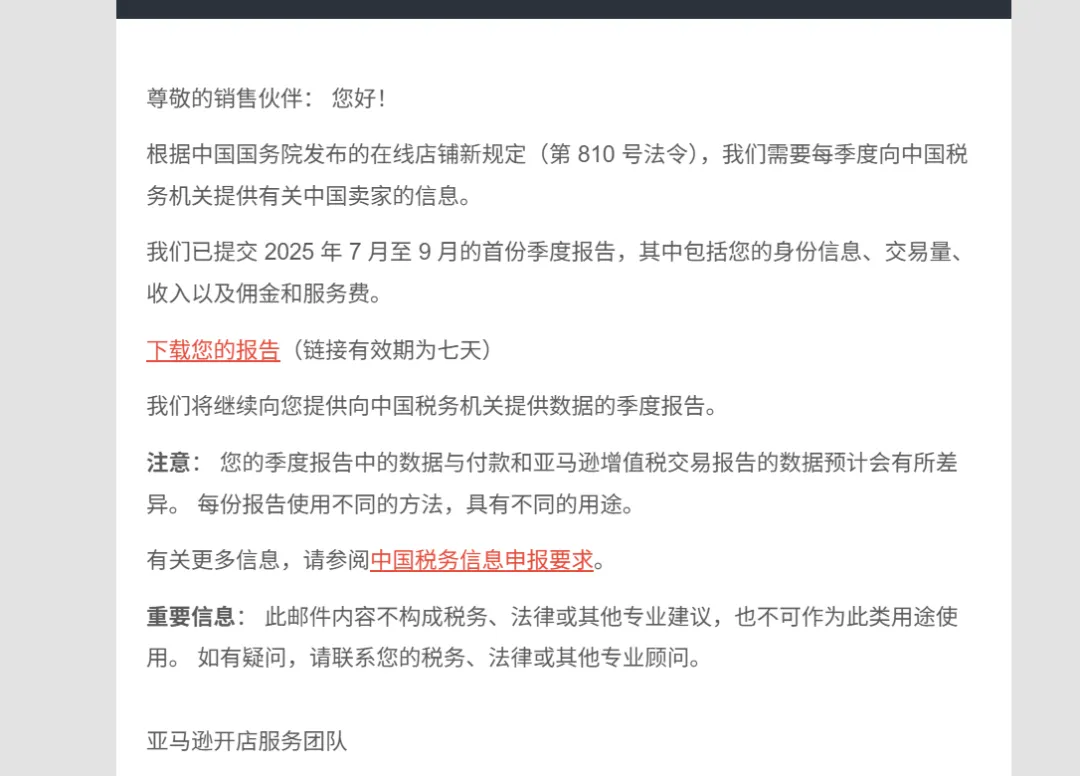 从12月22日晚到今早,大量亚马逊卖家在邮箱中收到了标题为 “查看您的2025年7月至9月的中国税务报告” 的邮件。随信附带的Excel表格,并非普通的对账单,而是亚马逊根据中国第810号法令,正式向国家税务机关提交的卖家交易数据的副本。
