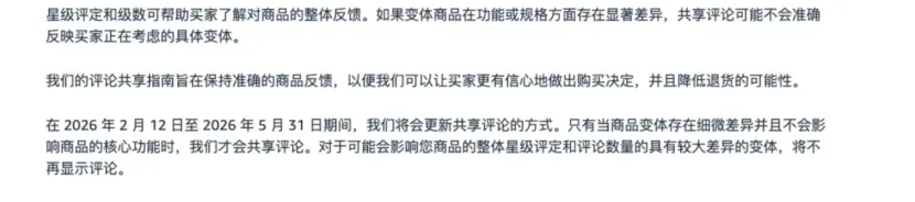 亚马逊已经明确,从2026年2月12日开始逐步调整评论共享逻辑,只有差异轻微且不影响核心功能的变体,评论才会继续共享;如果卖家在新规生效后更新了变体主题,符合条件的商品评论可以重新共享。这里最关键的词不是更新,而是符合条件。