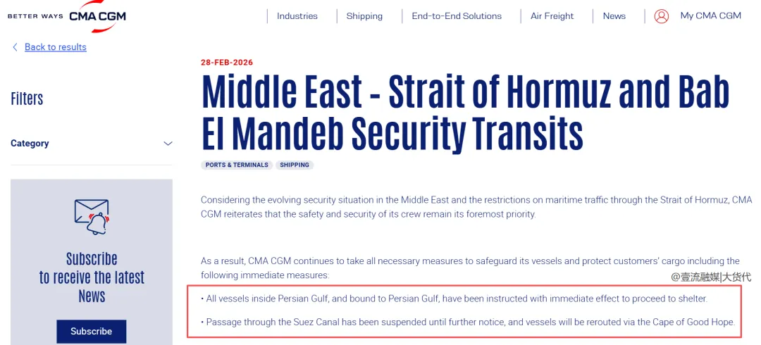法国班轮运输巨头-达飞在当地时间2月28号发出通知,称考虑到中东地区局势以及霍尔木兹海峡的海上交通限制,将采取以下紧急措施: