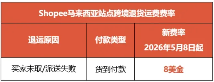 据 Shopee 消息,为了给卖家提供持续优质的物流服务,自 2026 年 5 月 8 日(北京时间)起,对于因买家未取/派送失败且满足跨境退货条件的 COD 货到付款退运包裹,Shopee 马来西亚站点将收取 8USD 每包裹的跨境退货运费。详情如下: